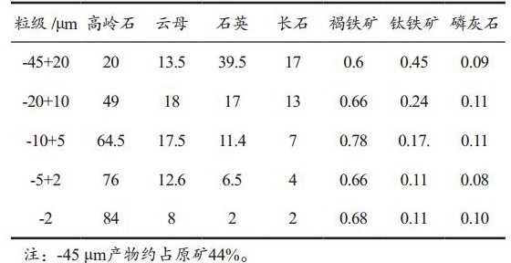 原礦的礦物成分以石英(43%-50%)、高嶺石(30%-40%)為主,云母類礦物(8%-18%)和殘留鉀長石(2%-10%),微量礦物(<1%)有褐鐵礦、鋯石、白鈦石、銳鐵礦、電氣石、赤鐵礦、金紅石等。45μm以下各粒級礦物成分與含量見表1。礦區主要礦體粒度組成見表2。