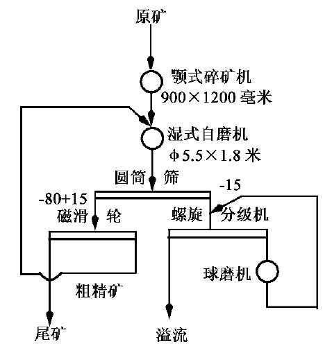 生產(chǎn)初期采用兩毆全閉路半自磨流程醫(yī)圖1(a)。原礦粗碎至350~0毫米,給入濕式自磨機磨碎,自磨機與高堰式螺旋分級機由泥勺機提升組成閉路。自磨機排礦經(jīng)圓筒篩過篩后,+10毫米物料返回自磨機,篩下物料進螺旋分級機分級,返砂也返回自磨機,分級溢流細度為50%~200目左右。分級溢流經(jīng)一段磁力脫水槽脫泥、脫水,并廢棄部分尾礦后,進入第二段磨礦。第二段磨礦為溢流型球磨機與螺旋分級機組成的預(yù)檢分級磨礦回路,分級溢流細度為80%~200目,合格溢流進磁選選別。兩段閉路自磨流程的主要問題是,兩段磨礦的負荷不平衡,往往第一段負荷高,第二段負荷不足,而且難以調(diào)節(jié);同時,自磨機中易形成難磨粒級的聚集,致使自磨機的產(chǎn)量提不高,若加大給礦量,則自磨機造成“脹肚”。針對上述存在問題,將原流程改為兩段一開路,如圖1(b)。第一段自磨機開路工作,圓筒篩篩孔改為5毫米,取消了螺旋分級機,篩上產(chǎn)物不再返回自磨機,而給入第二段球磨機磨碎,篩下產(chǎn)物直接進磁力脫水槽和第二磨礦段。自磨機開路工作后提高了處理能力,第二段磨礦的負荷也得到提高,兩段磨礦的負荷趨于平衡。例:某鐵礦兩段半閉路半自磨流程。如圖2所示。