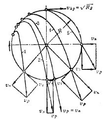 當(dāng)鋼球以速度vp到達(dá)落回點(diǎn)時(shí),它的動(dòng)能分解為兩部分:一部分沿打擊線OB(通過(guò)物體的打擊接觸點(diǎn),并垂直于接觸面的直線)沖擊礦石;另一部分與打擊線垂直,使鋼球沿切線方向運(yùn)動(dòng),這部分使礦石受磨剝而沒(méi)有沖擊作用。如果把vp分解為沿打擊線的徑向分速度vn和沿切向分速度v1,求出這兩個(gè)分速度,就可以知道沖擊礦石的能量和磨剝礦石的能量各占若干。