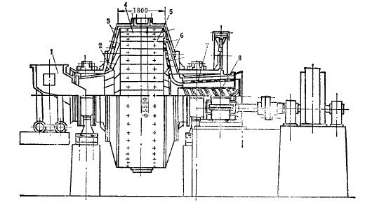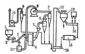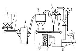 被粉碎的物料在主風(fēng)機(jī)10(主風(fēng)機(jī)的作用是使調(diào)節(jié)好的空氣流在自磨機(jī)和分級(jí)機(jī)內(nèi)循環(huán)并運(yùn)輸物料)造成的強(qiáng)大風(fēng)力作用下被連續(xù)排出,沿著管道進(jìn)入沉降箱6進(jìn)行第一次分級(jí),較粗的顆粒便沉降下來(lái)。細(xì)小的物料繼續(xù)進(jìn)入旋風(fēng)分離器7,進(jìn)行第二次分級(jí),這時(shí)絕大部分細(xì)小物料都沉降。已在沉降箱和旋風(fēng)分離器中沉降的物料靠鎖氣器8間斷排出,貯存在粉礦倉(cāng)9中,以便進(jìn)行干式磁選。