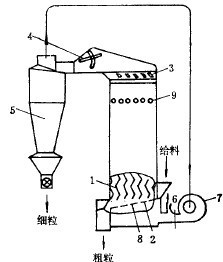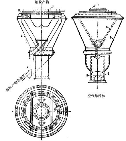 圖2所示的上升氣流風力分級機(附旋風集塵器),呈方形的分級室內,裝有若干近于平行的豎直“之”字形導板1。從料斗給到篩板2上的物料,在下部供入的上升氣流作用下,被帶到分級室中,經(jīng)過彎曲的導板上行過程中,粗的礦粒落下與未過篩的粗粒一起排出,為粗粒產(chǎn)物。細的礦粒經(jīng)上部通道入旋風集塵器分離,得細粒產(chǎn)物。集塵器上部排出的氣流,又回到風機,循環(huán)使用,或者從孔6中排走。