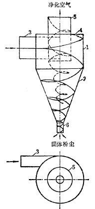 旋風集塵器的結構如圖5 所示,它的結構和分級原理與水力旋流器基本相同。只是其直徑要大些,介質是空氣。