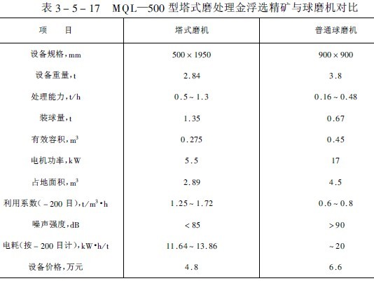 我國(guó)有關(guān)單位研制的MQL——500型螺旋攪拌塔式磨機(jī)也分干式、濕式兩種。濕式塔式磨機(jī)于1984年在大石河鐵礦選礦廠(chǎng)進(jìn)行過(guò)半工業(yè)試驗(yàn),后來(lái)在金廠(chǎng)裕金礦用作浮選金礦的再磨,以滿(mǎn)足該廠(chǎng)下步氰化浸出的要求。該廠(chǎng)采用一段塔式磨機(jī)可以將小于350目占64%的金浮選精礦磨細(xì)到小于350目占99.74%,磨機(jī)利用系數(shù)為0.485噸/米3時(shí),電能消耗為13.45千瓦/噸,鋼耗為4.65千克/噸,MQL——500型塔式磨機(jī)與球磨機(jī)工業(yè)試驗(yàn)指標(biāo)列于表3-5-17中。