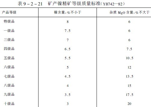礦產(chǎn)鎳精礦質(zhì)量標(biāo)準(zhǔn)列于表9-2-21。